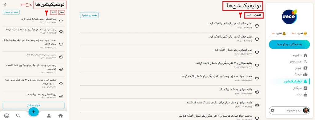 ۲- بر روی گزینه اعلان برای دیدن ریکوها و لایک و نظرات کلیک میکنید و همچنین میتوانید برای آگاهی از کارهایی که توسط مدیران و ادمینها برایتان تعریف شده است، بر روی گزینه کارها کلیک کنید.